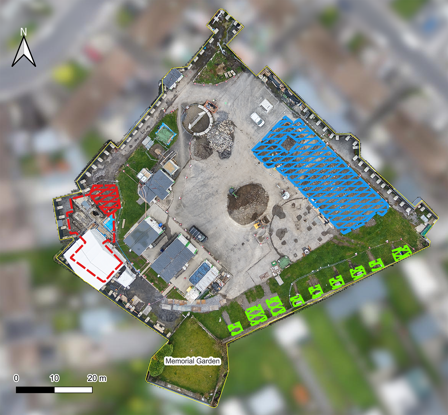 Forensic excavation of the site of the former Mother and Baby Institution in Tuam continues. In the photo below, all areas that have been excavated are outlined in colour and all areas that are considered resolved are hatched. In this reporting period, excavation has focused on two locations outlined in the photo below: