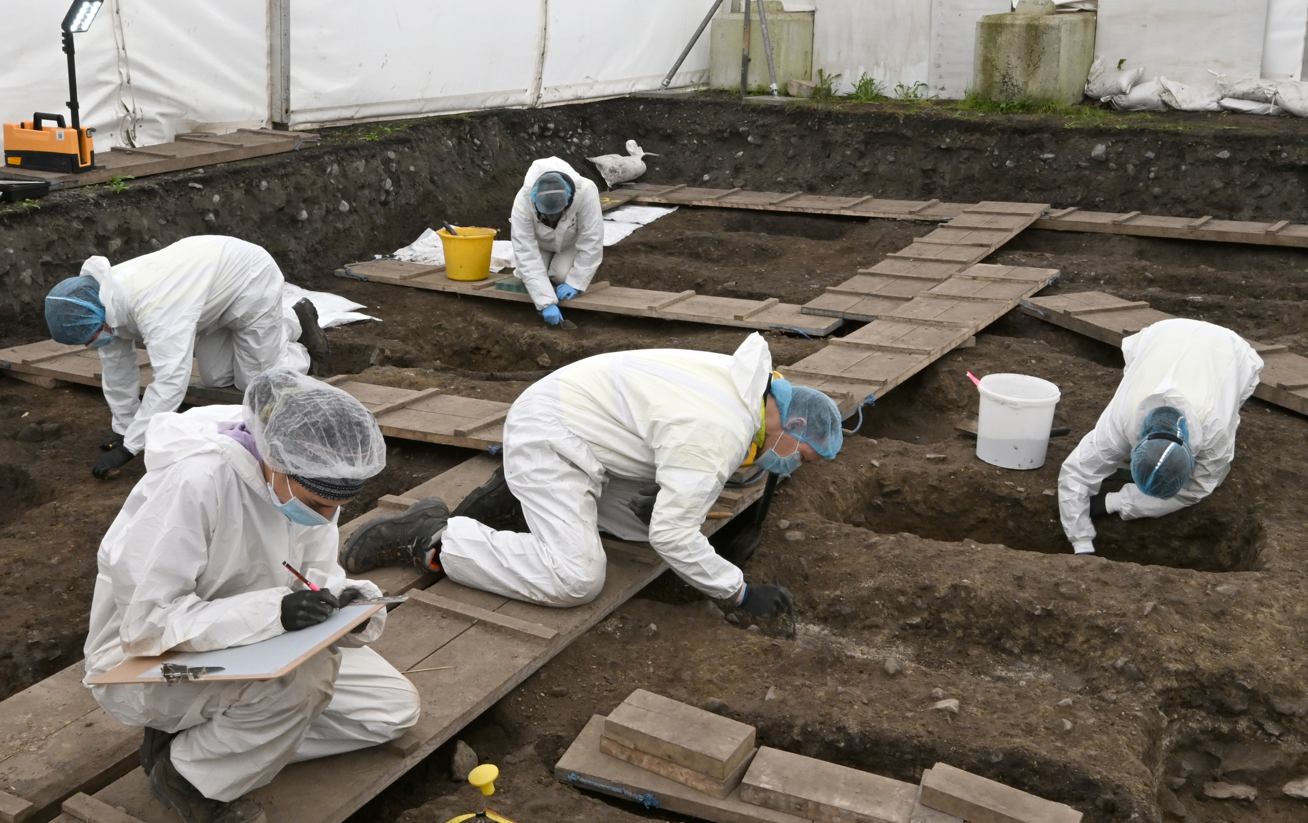 Red outline (part under white tent): Hand excavation continued under a temporary tent.