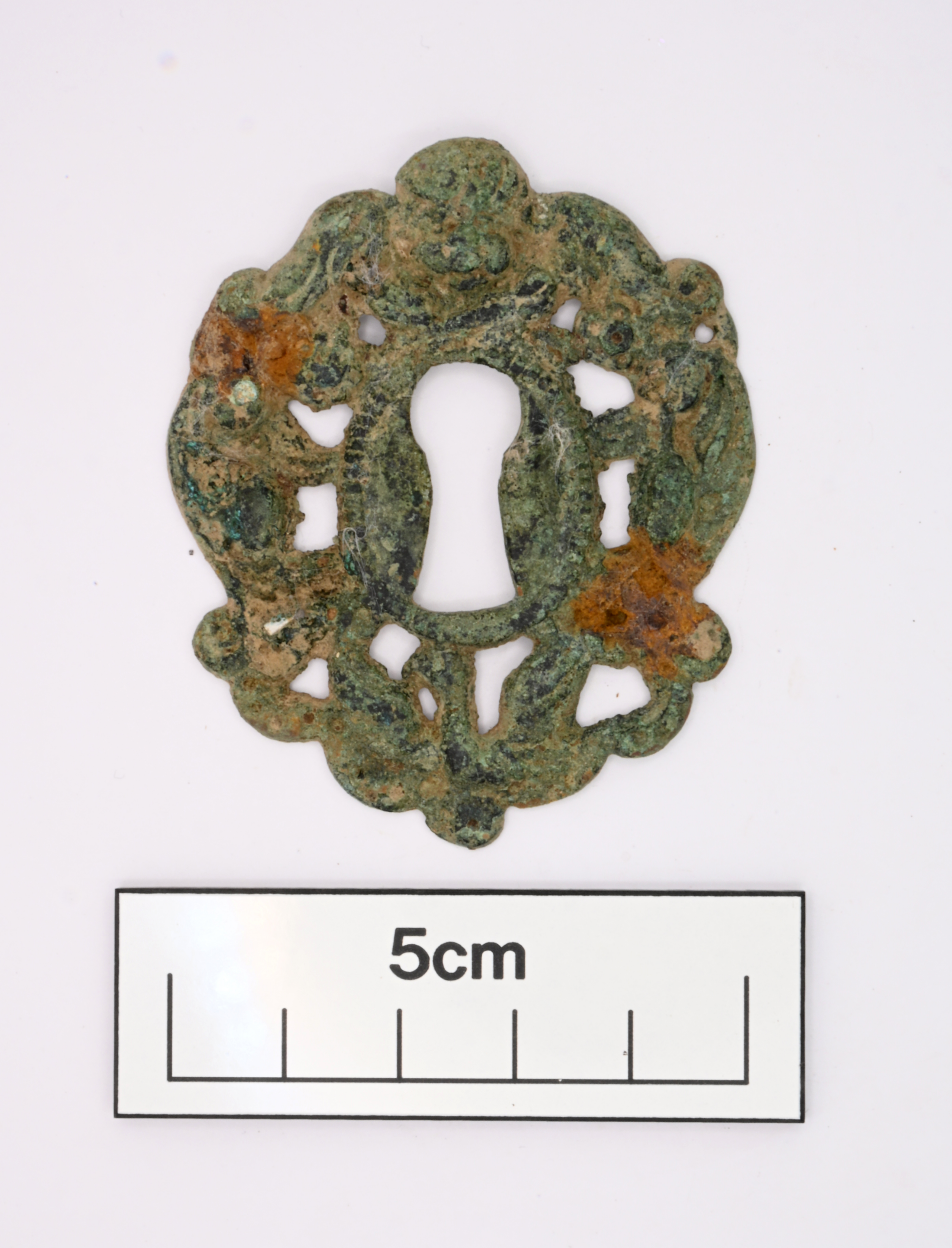 Artefacts from various historic periods continue to be recovered. Items of note include a post-medieval cast copper-alloy keyhole escutcheon. The keyhole is flanked by symmetrical foliate openwork; a winged cherub is located above the keyhole, and a waterbird is underneath.